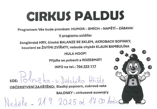 Cirkus Paldus a jeho klaun Bambulína vás srdečně zvou na své vystoupení,